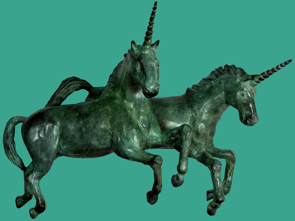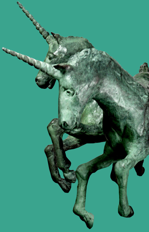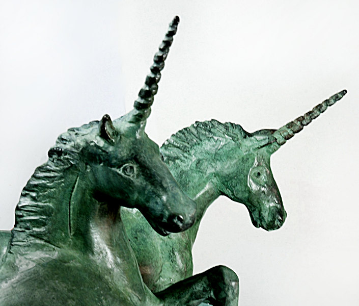 There is little unicorn sculpture. Aside from those recent Jean Fabre "Self-Portrait Unicorn" and Damien Hirst "Young unicorn in formaldehyde." The most vivid representation is undoubtedly "The Unicorn and the Dragon" anonymous sculpture which is presented in Le domaine de Sceaux (Near Paris). Everything is there: the dragon has webbed feet, a serpent's tail and wings of bats ... The unicorn shoves his horn in the dragon's mouth.![]()
