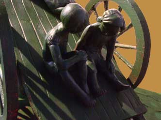 Two carts surround a dead tree. But is that tree really dead? A healthy growth seems to sprout out of the trunk... A growth brimming with life! Perhaps it could be a symbolic image: Children, quite alive, in an almost dead universe...