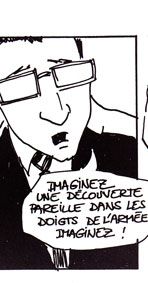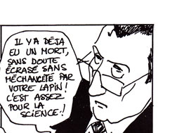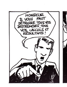 The text of this page : Sir, you must destroy all your instruments, all calculations and results ! Imagine such a discovery in the fingers of the army! Imagine ! One dead already ... probably crashed without malice by your rabbit ! That's enough for science ! Since several days now, I meditated on this topic ... DESTROY EVERYTHING ! what is his name already ? Tomorrow we will leave, sure ! |