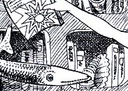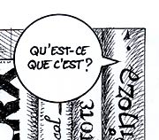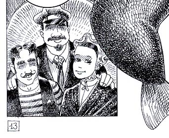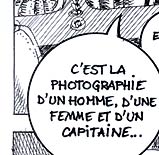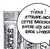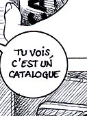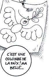 The text of this page: Le brochet : "Tiens ! Attrape-moi cette brochure entre les deux gros livres" La sirène : "Qu'est-ce que c'est ?" Le brochet : "Tu vois, c'est un catalogue" La sirène : "C'est utile ?" Le brochet : "Oui, très précieux..." La sirène : "Et ça ? là !" Le brochet : "C'est la photographie d'un homme, d'une femme et d'un capitaine..." La sirène : "Et ce petit dessin rigolo ?" Le brochet : "C'est une colombe de la Paix ! Ma belle..." |