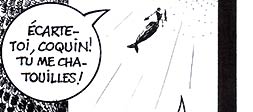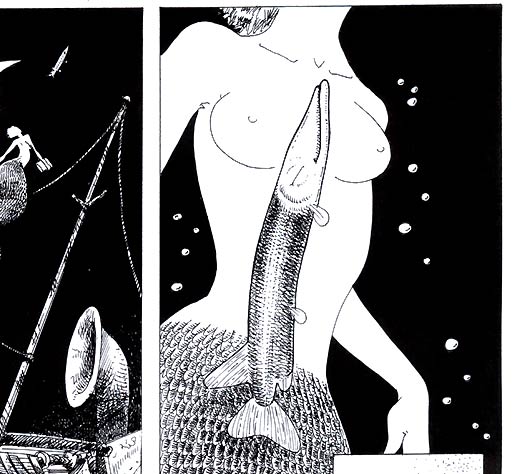 The text of this page: La sirène : "On s'en va déjà ?" Le brochet : "Oui !... J'ai trouvé ce que j'étais venu chercher." La sirène : "Ecarte-toi coquin ! Tu me chatouilles !" |