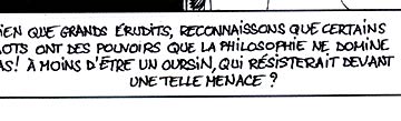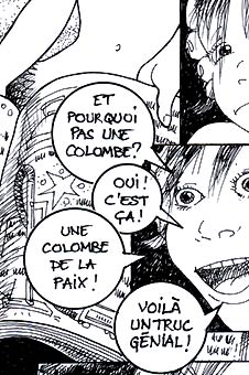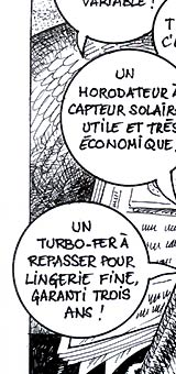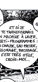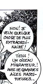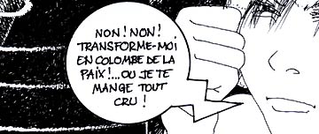 The text of this page: Le brochet : "Voyons ce que je peux faire pour toi !... Quelque chose d'utile... Et si je te transformais en machine à laver multi-programmes : " La sirène : "Quoi !" Le brochet : "eau chaude, eau froide, essorage, brossage... " La sirène : "Ca va pas !" Le brochet : "C'est très utile, crois moi..." La sirène : "Je rêve !" Le brochet : "Un aspirateur à centrifugeuse variable !" La sirène : "Non ! Je veux quelque chose de plus extraordinaire !.. Tiens ! Un oiseau migrateur ! Avec de grandes ailes majestueuses..." Le brochet : "Un aspirateur à centrifugeuse variable !... Je t'assure, c'est très utile... Un horodateur à capteur solaire ! Utile et très économique !" La sirène : "...ou une gentille petite mouette ! Et pourquoi pas une colombe ? Oui ! C'est ça ! Une colombe de la Paix Voilà un truc génial !" Le brochet : "...Un turbo-fer à repasser pour lingerie fine, garanti trois ans !" La sirène : "Non ! non ! Transforme-moi en colombe de la Paix !... ou je te mange tout cru !" Bien qu grands érudits, reconnaissons que certains mots ont des pouvoirs que la philosophie ne domine pas ! A moins d'être un oursin, qui résisterait devant une telle menace ? |