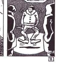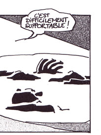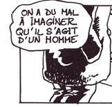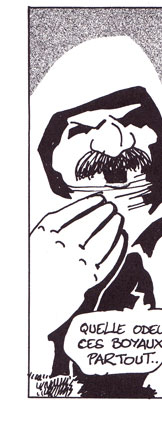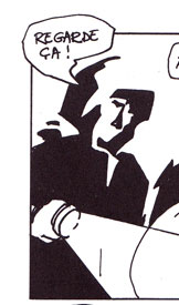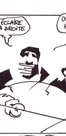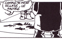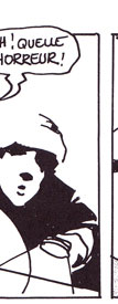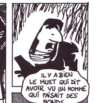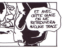 Le texte des bulles de cette page: Regarde ça ! Eclaire à Droite. Oh ! Quelle horreur ! C'est difficilement supportable ! On a du mal à imaginer qu'il d'un homme. Complètement éclaté le pauvre. Et avec cette glace, on ne retrouvera aucune trace. Quelle odeur, ces boyaux partout... A-t-on quelques indices... ou un témoignage ? Il y a bien le muet qui dit avoir vu un homme qui faisait des bonds... |