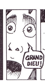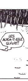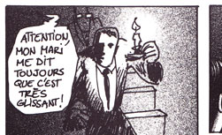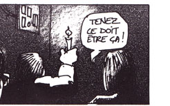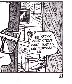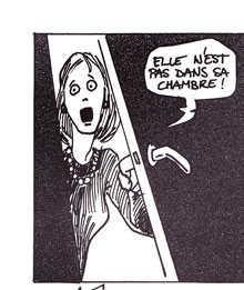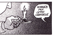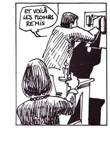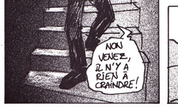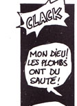 Le texte des bulles de cette page: Elle n'est pas dans sa chambre ! GRAND DIEU ! Les aura-t-elle suivis ? Peut-être est-elle avec eux ? Mon Dieu ! Les plombs ont du sauter ! Rien de grave, où sont-ils ? A la cave. Attention, mon mari me dit toujours que c'est très glissant ! Non venez, il n'y a rien à craindre ! Tenez ce doit être ça ! Donnez-moi cette chandelle. Et voila, les plombs sont remis. Eh ! Venez voir !... Qu'est ce que c'est que toutes ces "choses" là. |
