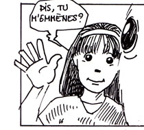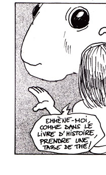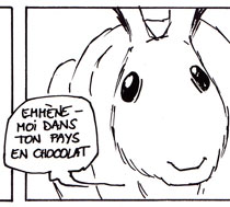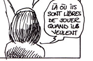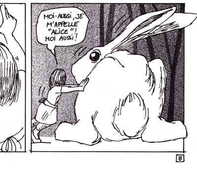 Le texte des bulles de cette page: Dis, tu m'emmènes ? Emmène-moi dans ton pays en chocolat Conduis-moi là où ne jouent que les enfants. Là où ils sont libres de jouer quand ils veulent. Emmène-moi comme dans le livre d'histoire, prendre une tasse de thé ! Moi aussi, je m'appelle "Alice" ! Moi aussi ! |