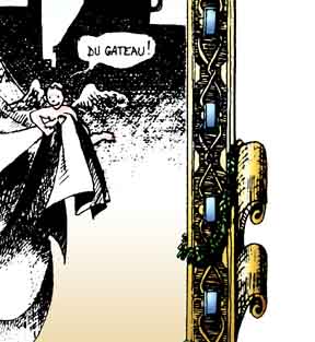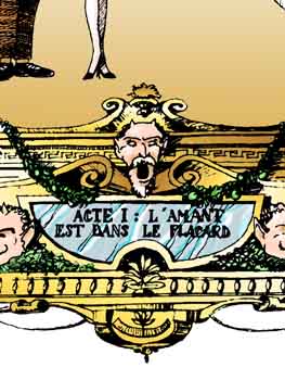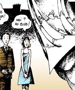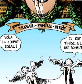 Le texte des bulles de cette page: TRAVAIL-FAMILLE-PATRIE - Voila le couple idéal! - Il est timide, elle est romantique. - Du gâteau! - Je passe mes vacances à Barbezieux! et vous? - Moi ? au club! - Ce n'est donc pas là que nous nous sommes déjà vus. Acte I: L'AMANT EST DANS LE PLACARD - Ca commence bien ! |
