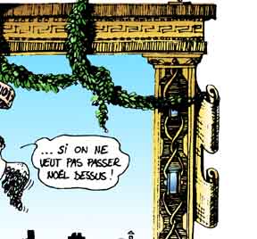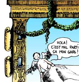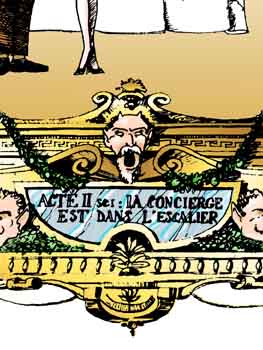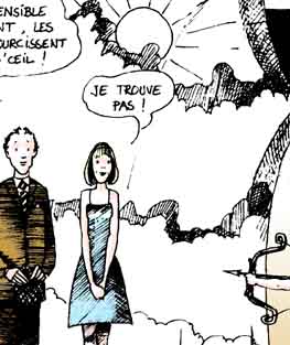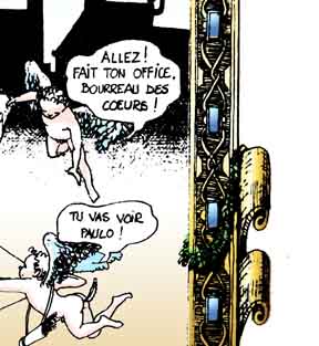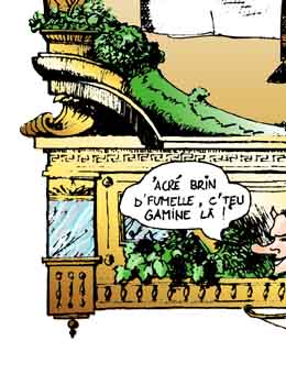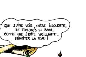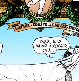 Le texte des bulles de cette page: Que j'aime voir, chère indolente, De ton corps si beau, Comme une étoffe vacillante, Miroiter la peau! LIBERTE-EGALITE-JE NE SAIS PLUS QUOI. - Hola ! C'est mal parti ça mon gars! - Ouais, il va falloir accelerer ça ! - Si on ne veut pas passer noël dessus ! - Allez ! fait ton office, bourreau des coeurs ! - Tu vas voir Paulo ! - C'est sensible maintenant, les jours raccourcissent à vue d'oeil ! - Je ne trouve pas ! - C'est peut-être ma montre qui retarde ! Acte II: LA CONCIERGE EST DANS L'ESCALIER. - 'Acré brin d'fumelle, c'teu gamine-là! |
