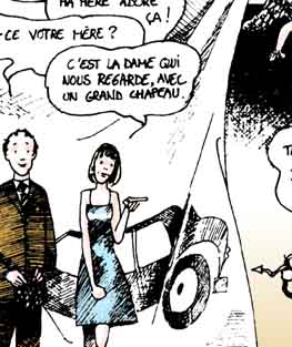 - C'est la dame qui nous regarde avec un grand chapeau.