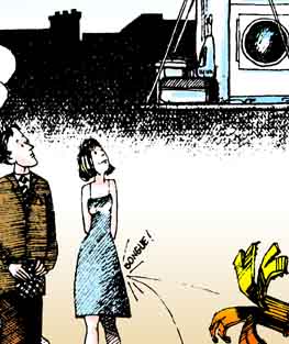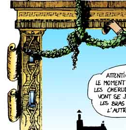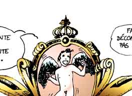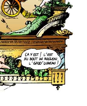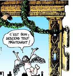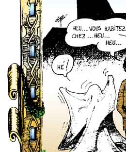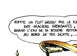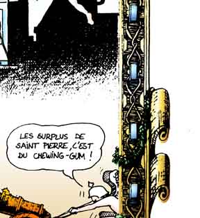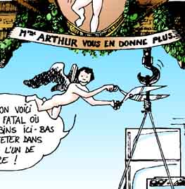 Le texte des bulles de cette page: Comme un flot grossi par la fonte Des glaciers grondants, Quand l'eau de ta bouche remonte Au bord de tes dents,.. (poeme de Charles Beaudelaire) - Faut pas déconner, on est pas des bêtes ! Mme ARTHUR VOUS EN DONNE PLUS - Attention voici le moment fatal où les chérubins ici-bas vont se jeter dans les bras l'un de l'autre ! - C'est bon ! Descend tout maintenant ! - Les surplus de saint Pierre, c'est du chewing-gum ! - Hé ! - Heu... vous habitez chez... heu ... heu... Acte iV scene II: L'OEIL EST DANS LA SERRURE - ça y est ! L'est au bout du rouleau l'gaud'lureau ! |