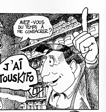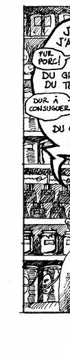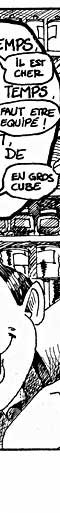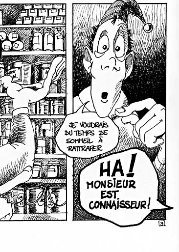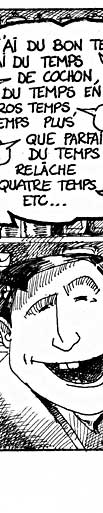 Le texte des bulles de cette page: - Avez-vous du temps à me consacrer ? - J'ai tout ce qu'il faut : J'ai du bon temps (il est cher) Du temps de cochon (pur porc) Du temps en temps (faut être équipé) Du gros temps Du temps plus que parfait (il est dur à conjuguer) Du temps de relâche Du quatre temps (en gros cube) etc... - je voudrais du temps de sommeil à rattraper - Ha ! Monsieur est connaisseur ! |