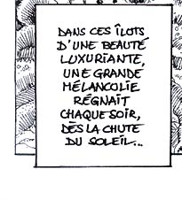 Le texte de cette page: Dans ces îlots d'une beauté luxuriante, une grande mélancolie régnait chaque soir dès la chute du soleil... La sirène : "...Je m'ennuie à mourir..." |