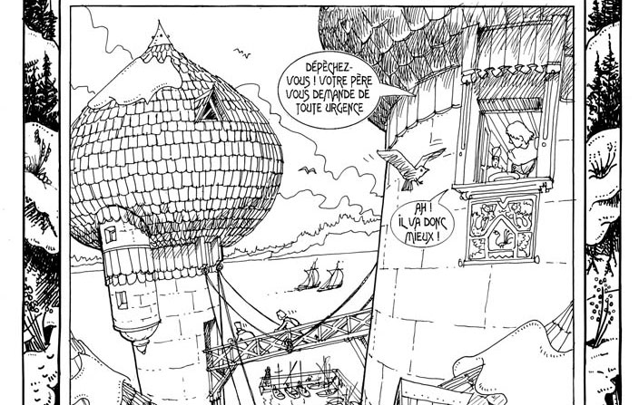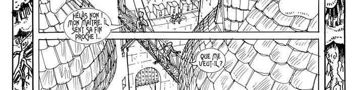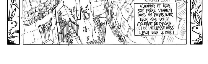 Le texte des bulles de cette page: Le comte russe. - Dépêchez-vous, votre père vous demande de toute urgence ! - Ah ! il va donc mieux ! - Hélas non ! mon maître. Il sent sa fin proche... - Que me veut-il ? Vladimir et Igor, son frère, vivaient dans un palais avec leur père qui se mourrait de chagrin (et de vieillesse aussi, il faut bien le dire ) |