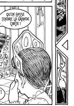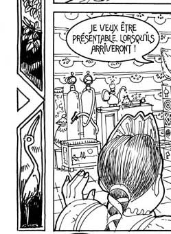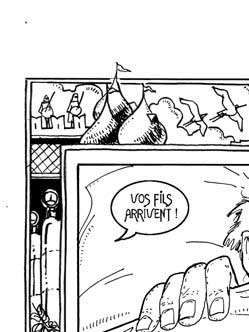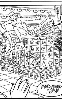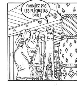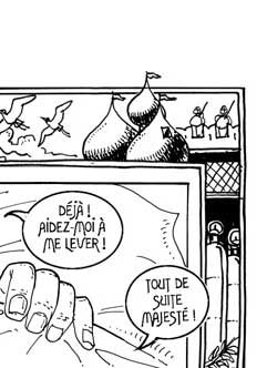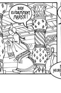 Le texte des bulles de cette page: - Vos fils arrivent ! - Déjà ! Aidez-moi à me lever ! - Tout de suite Majesté. - Je veux être présentable, lorsqu'ils arriveront. - Immédiatement Majesté. - Qu'on fasse tendre la grande carte ! N'oubliez pas les fléchettes d'or ! - Evidemment Majesté. - Ah ! vous voila enfin, mes garçons - Nous sommes heureux de vous voir debout, père. - Moi aussi, mes enfants. |