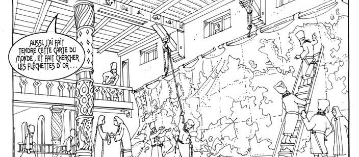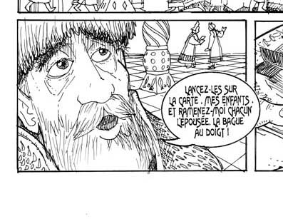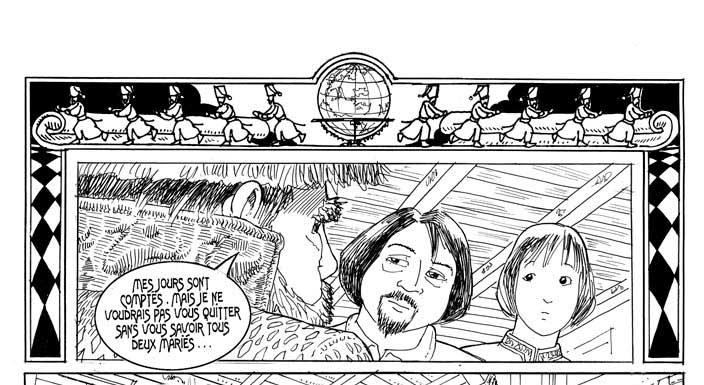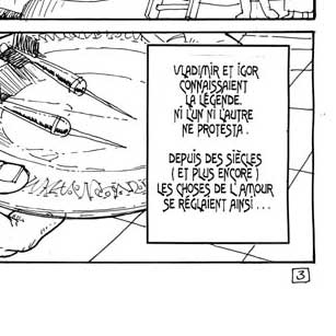 Le texte des bulles de cette page: - Mes jours sont comptés, mais je ne voudrais pas vous quitter sans vous savoir tous deux mariés... Aussi j'ai fait tendre cette carte du monde et fait chercher les fléchettes d'or. - Lancez-les sur la carte, mes enfants, et ramenez-moi chacun l'épousée, la bague au doigt ! Vladimir et Igor connaissaient la légende. Ni l'un ni l'autre ne protesta. Depuis des siècles (et plus encore) les choses de l'amour se réglaient ainsi... |