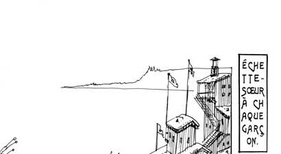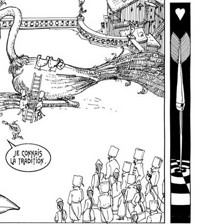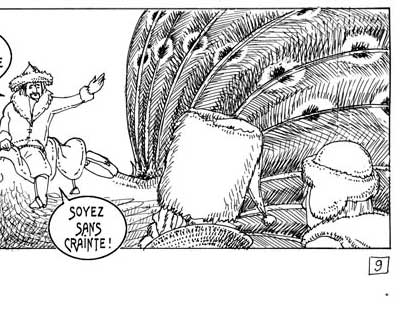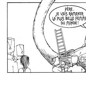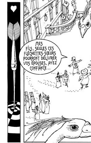 Le texte des bulles de cette page: On prit bien soin de donner une fléchette-soeur à chaque garçon - Mes fils, seules ces fléchettes-soeurs pourront délivrer vos épouses, ayez confiance... - Je connais la tradition... ...Père, je vais ramener la plus belle femme du monde ! Soyez sans crainte ! |