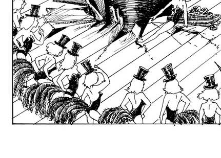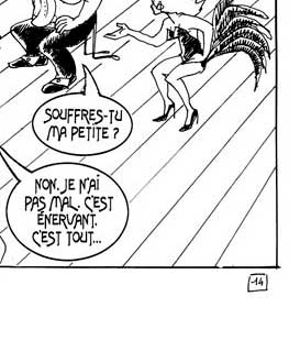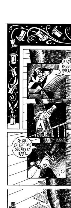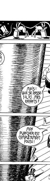 Le texte des bulles de cette page: - Je vais passer par là ! Oh oh ! J'ai fait des dégâts en bas !... - Patron! patron, C'est affreux - Mais que se passe-t-il ici, mes enfants ? - Regardez patron ! Juste avant la revue ! - Mon plancher est complètement foutu !... ...Souffres-tu ma petite ? - Non, je n'ai pas mal. C'est énervant, c'est tout... |