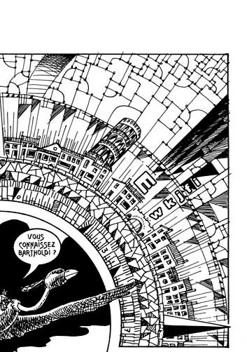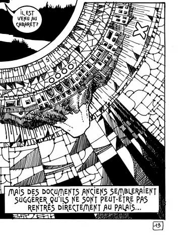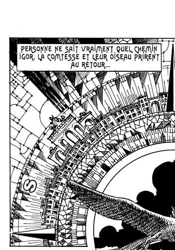 Le texte des bulles de cette page: Personne ne sait vraiment quel chemin Igor, la comtesse et leur oiseau prirent au retour... - Vous connaissez Bartholdi ? - Il est venu au cabaret ? Mais les documents anciens sembleraient suggérer qu'ils ne sont peut-être pas rentrés directement au palais... |