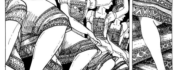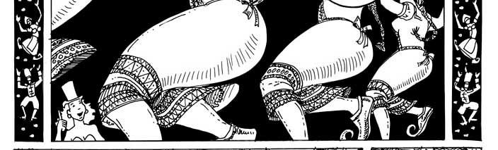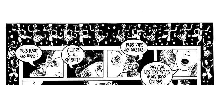 Le texte des bulles de cette page: Plus haut les bras ! Allez ! 3... 4... on suit ! Plus vifs, les gestes ! Pas mal les costumes, mais trop lourds... Elles ne sont pas terribles ces babouches ! |