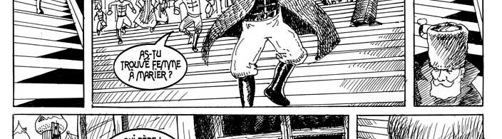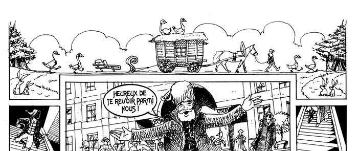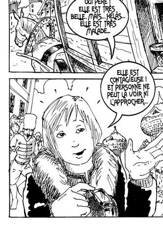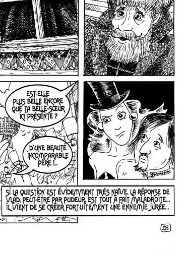 Le texte des bulles de cette page: - Heureux de te revoir parmi nous ! - As-tu trouvé femme à marier ? - Oui père ! Elle est très belle, mais... Hélas... Elle est très malade... - Elle est très contagieuse et personne ne peut la voir ni l'approcher... - Est-elle plus belle encore que ta belle-soeur ici présente ? - D'une beauté incomparable père !... - Si la question est évidemment très naïve, la réponse de Vlad, peut-être par pudeur, est tout à fait maladroite... Il vient de se créer fortuitement une ennemie jurée... |