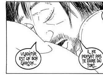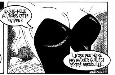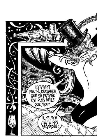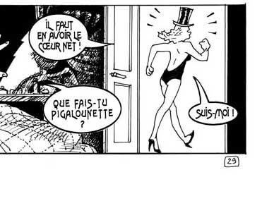 Le texte des bulles de cette page: - Comment peut-il déclarer que sa femme est plus belle que moi ? Il ne m'a même pas regardée ! - Vladimir est un bon garçon... Il ne pensait pas te faire du tort... - Existe-t-elle au moins cette femme ?! Il n'ose peut-être pas avouer qu'il est rentré bredouille. - Il faut en avoir le coeur net ! - Que fais-tu Pigalounette ? - Suis-moi ! |