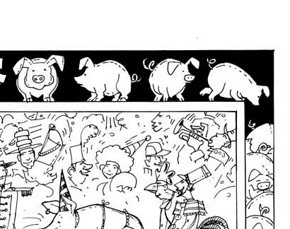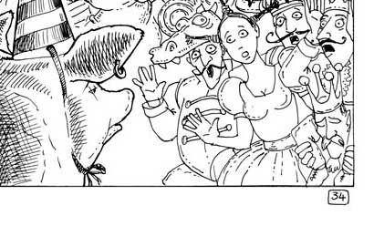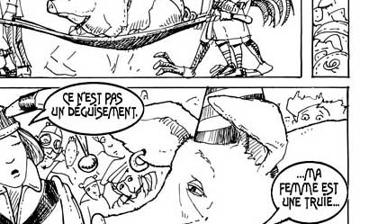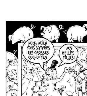 La traducción de esta página : - ¡ Nosotros he aquí ! ¡ Somos las cochinas gruesas ! ¡ Sus nueras ! - ¡ Oh! ¡ Qué bellos disfraces ! ¡ Creemos en eso ! - Padre, en cuanto a mi mujer... No es un disfraz... Mi mujer es una cerda... Vea el anillo que lleva a la oreja... - ¡ Sí, el anillo ! ¡ Mi nuera ! ¿ Una cerda? Arghh ! - ¡ La maldición ! - ¡ La maldición ! |