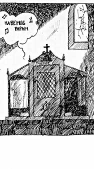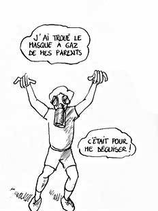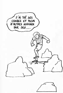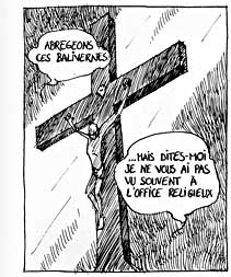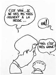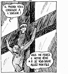 Le texte des bulles de cette page: J'ai tué des crabes et plein d'autres animaux, par jeu... J'ai jeté un bidon d'essence dans le puits J'ai troué le masque à gaz de mes parents C'était pour me déguiser ! - Abrégeons ces balivernes ...Mais dites-moi, je ne vous ai pas vu souvent à l'office religieux. - C'est vrai, je ne vais pas très souvent à la messe... - Oh ! Mais c'est très grâve ! Il faudra vous corriger à l'avenir ! Vous me ferez 1 notre père et 2 je vous salue, Allez mon fils ! Habemus papam suivant ! |