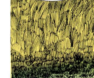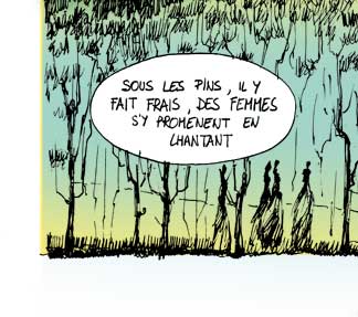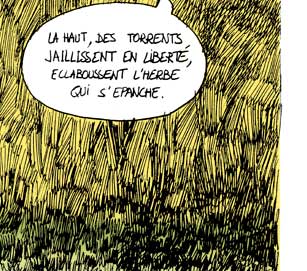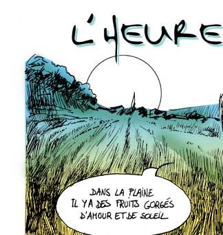 Le texte des bulles de cette page: L'HEURE Dans la plaine, il y a des fruits gorgés d'amour et de soleil. Là haut, des torrents jaillissent en liberté, éclaboussent l'herbe qui s'épanche. Sous les pins, il y fait frais, des femmes s'y promènent en chantant. |