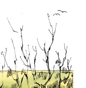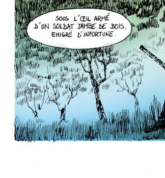 Le texte des bulles de cette page: Des femmes longues comme des pendus... La chaleur obéit au silence, le silence obéit à la guerre. Des femmes longues et belles battent les blés. Sous l'oeil armé d'un soldat jambe de bois, imigré d'infortune. |