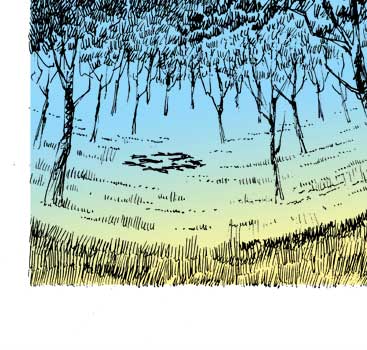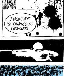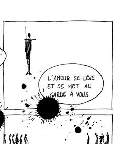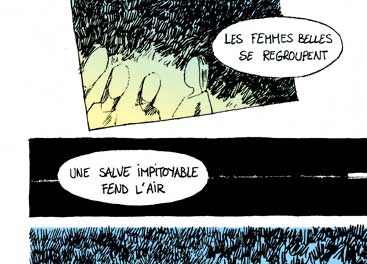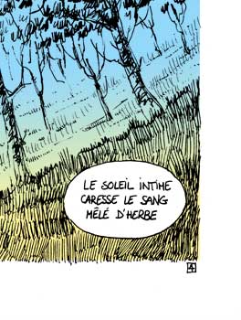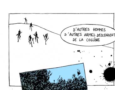 Le texte des bulles de cette page: D'autres hommes, d'autres armes descendent de la colline. L'amour se lève et se met au garde à vous. Les femmes belles se regroupent. L'inquiétude est chargée de mots-clefs. Une salve impitoyable fend l'air. Le soleil intime caresse le sang mêlé d'herbe. |