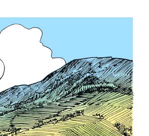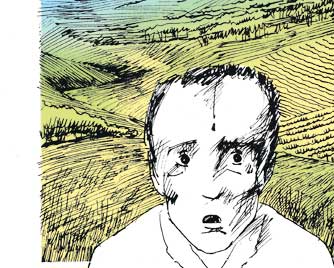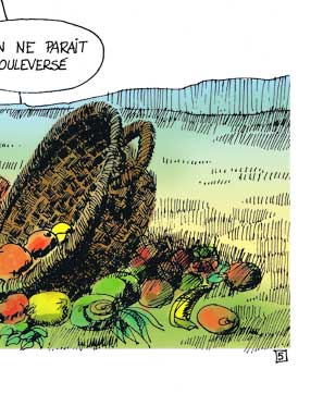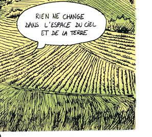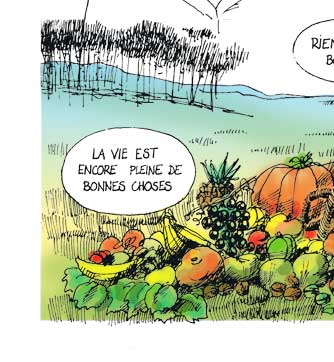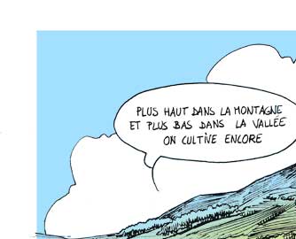 Le texte des bulles de cette page: Plus haut dans la montagne, et plus bas dans la vallée, on cultive encore. Rien ne change dans l'espace du ciel et de la terre. Rien ne paraît bouleversé. La vie est encore pleine de bonnes choses. |