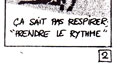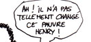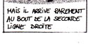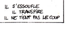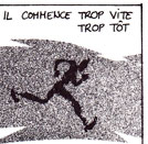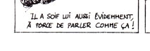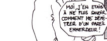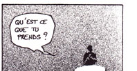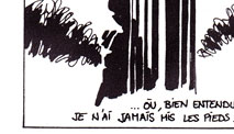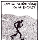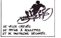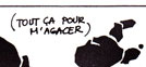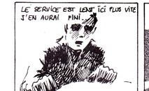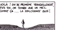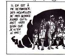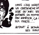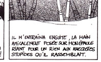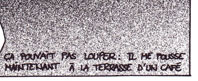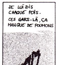 Le texte des bulles de cette page: Le rescapé Il me rappela d'anciens souvenirs d'enfance, la Pôle nord et la Grèce... ... où bien entendu je n'ai jamais mis les pieds ! Il m'entraîna ensuite, la main amicalement posée sur mon épaule, riant pour un rien aux anecdotes stupides qu'il rassemblait. Il y était question de tir boulettes, de vélo crevés, de patins à roulettes et de pantalons déchirés. Il en avait les larmes aux yeux de s'esclaffer ! Moi j'en étais à ne plus savoir comment me dépêtrer d'un pareil emmerdeur! Voilà ! On se promène tranquillement, puis toc, on tombe sur un mec comme ça... La malchance quoi ! ça ne pouvait pas louper, il me pousse maintenant à la terrasse d'un café. Alors qu'est-ce que tu prends ? Un demi. Il en est à me demander des nouvelles de mes gosses alors qu'il sait très bien que je n'en ai pas! Tout ça pour m'agacer. Dans cinq minutes il va certainement me dire qu'avec ses trois enfants, sa femme et son hamster, ça fait six parts... Autant à déduire de ses impôts. C'est chaque fois la même chose ! Ah ! Il n'a pas tellement changé ce pauvre Henry ! Toujours égal à lui-même. Le service est lent ici. Plus vite j'en aurai fini... Il a soif, lui aussi, évidemment, à force de parler comme ça ! Il commence trop vite, trop tôt. Il s'essouffle, il transpire, il ne tient pas le coup. Jusqu'au premier virage, ça va encore! Mais il arrive rarement au bout de la seconde ligne droite. Je lui dis chaque fois. Ces gars-là, ça manque de poumons, ça sait pas respirer "prendre le rythme". |