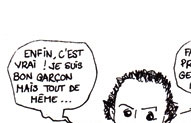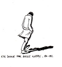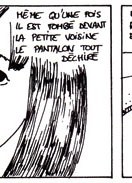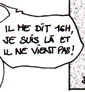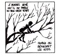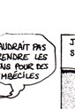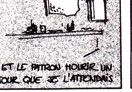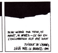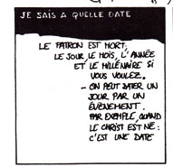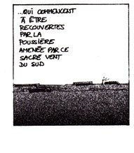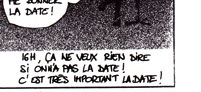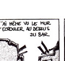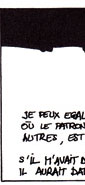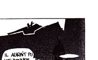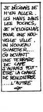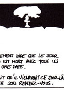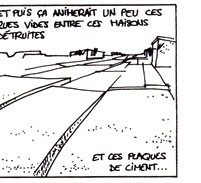 Le texte des bulles de cette page: Le rescapé (page 4) Enfin, c'est vrai ! Je suis bon garçon mais tout de même... Faudrait pas me prendre pour un imbécile. Il me dit 16h, je suis là et il ne vient pas ! J'ai même vu le mur s'écrouler au dessus du bar. Et le patron mourir le jour où je l'attendais. Il aurait pu me donner la date ! 16 h, ça ne veut rien dire si on a pas la date ! C'est très important la date! Je sais à quelle date, le patron est mort, le jour, le mois, l'année et le millénaire si vous voulez. On peut dater un jour par un événement. Par exemple, quand le Christ est né, c'est une date. Je peux également dire que le jour où le patron est mort avec tous les autres, est une date. S'il m'avait dit qu'il viendrait ce jour-là, il aurait daté son rendez-vous. Je ne serais pas venu, ni avant, ni après - ce qui, en l'occurrence, eut été idiot puisque je l'aurais déjà pris ce rendez-vous. J'aurais aimé qu"il me parle du bon vieux temps, quand on dénichait les nids. Même qu'une fois il est tombé devant la petite voisine le pantalon tout déchiré. Et puis ça animerait un peu ces rues vides entre ces maisons détruites. et ces plaques de ciments... ...qui commencent à être recouvertes par la poussière amenée par ce sacré vent du sud. Je décidai de m'en aller. Les mains dans les poches, je m'éloignais pour une nouvelle ville, un nouveau quartier... ou devant une terrasse de café j'aurai peut-être la chance de rencontrer l'autre. |