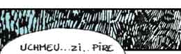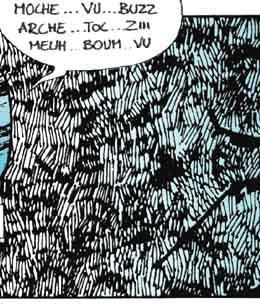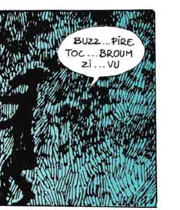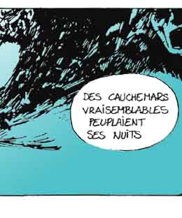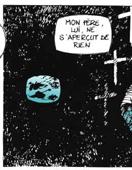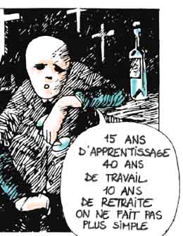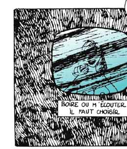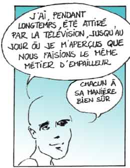 Le texte des bulles de cette page: - Boire ou m'écouter, il faut choisir. - J'ai, pendant longtemps, été attiré par la télévision, jusqu'au jour où je m'aperçux que nous faisions le même métier d'empailleur. - Mon père, lui, ne s'aperçut de rien. - 15 ans d'apprentissage, 40 ans de travail, 10 ans de retraite, on ne fait pas plus simple. - Des cauchemars vraissemblables peuplaient ses nuits. |