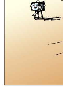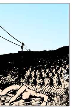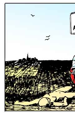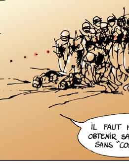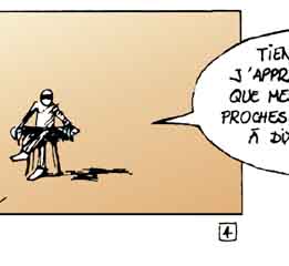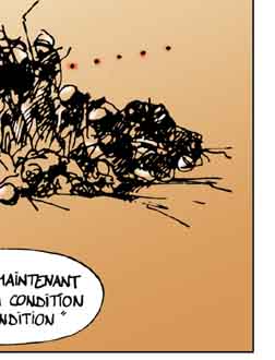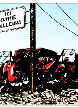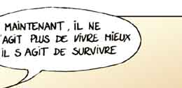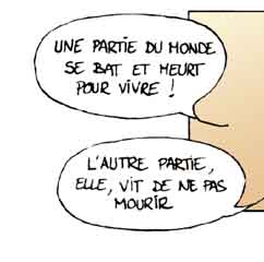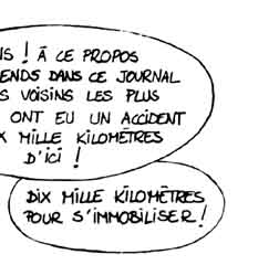 Le texte des bulles de cette page: - Maintenant, il ne s'agit plus de vivre mieux, il s'agit de survivre. - Il faut maintenant obtenir sa condition sans "conditions". - Une partie du monde se bat et meurt pour vivre!... L'autre partie, elle, vit de ne pas mourir... Tiens! à ce propos j'apprends dans ce journal que mes voisins les plus proches ont eu un accident à dix mille kilomètres d'ici!... Dix mille kilometres pour s'immobiliser!... |