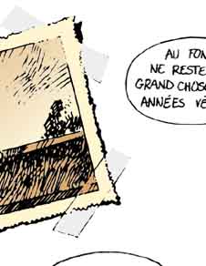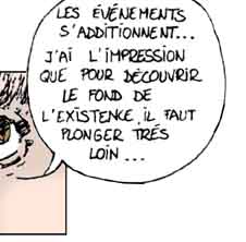 Le texte des bulles de cette page: - Au fond il ne reste pas grand chose des années vécues. - Les événements s'additionnent... J'ai l'impression que pour découvrir le fond de l'existence, il faut plonger très loin... - ...au risque de s'y noyer ! - Salut. |