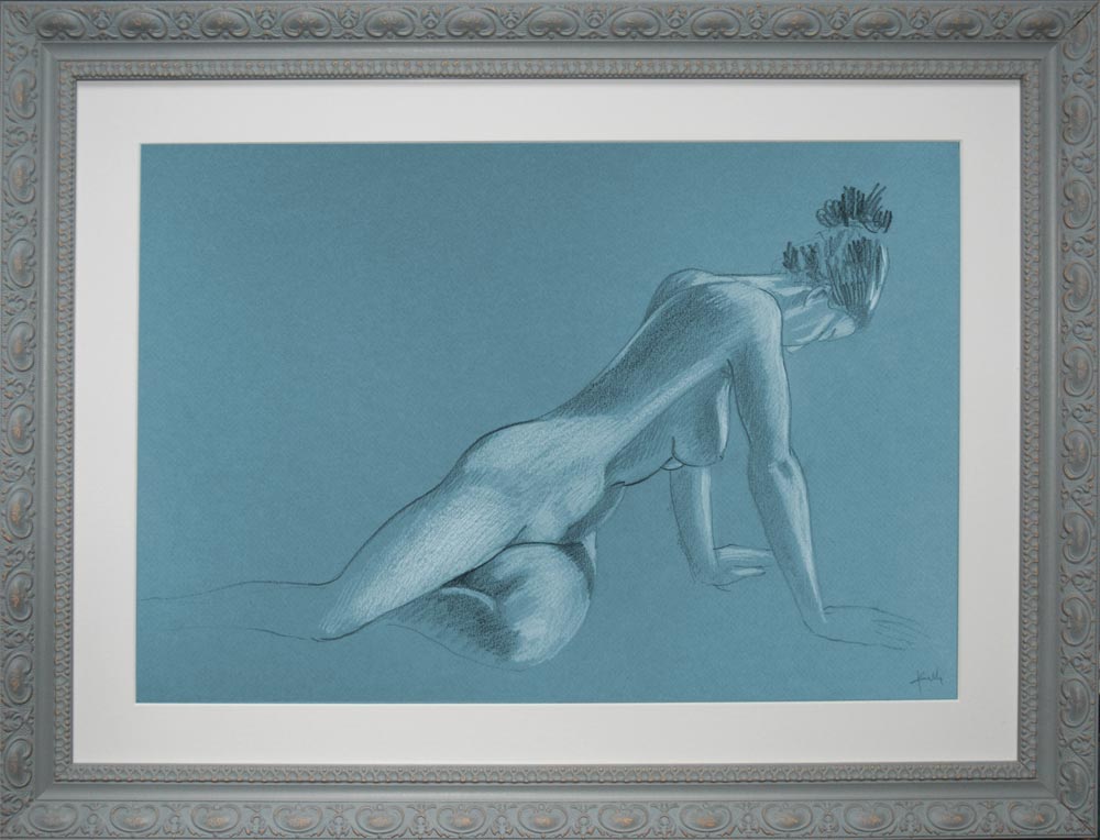 Ce dessin est encadré comme "Rêveuse". même baguette, même passe-partout, même dimensions. Ces deux dessins, issus de la même séance de pose, vont ensemble.