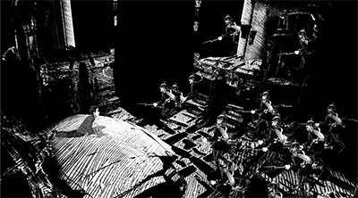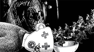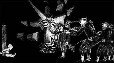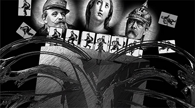 He climbs along a cube and reaches the top... Soldiers from both sides advance against each otherlike in a card game. Arrived at the edge of the cube, they are killed as at the carnival. Arthur is horrified! He no longer knows "to what saint he should dedicate himself"... He wonders: "… What lie should I hold? In which blood to walk? " |