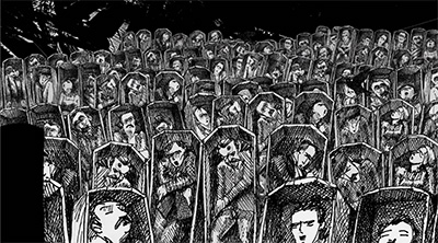 Behind Rimbaud, symbolically murdered, thousands of Communards lie in their coffins... Rimbaud feels helpless. |