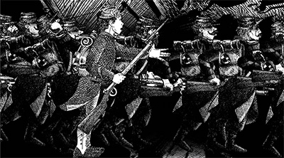 "You have to be modern." From the skull of Rimbaud which opens, an army of Prussians springs from it. |