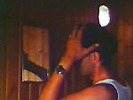 A man prepares his panoply of sailor, cap, tattooings etc... |