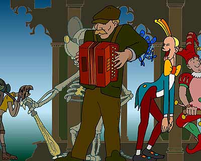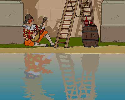 | Harlequin plays of the mandoline under scaffolding. (Credits)