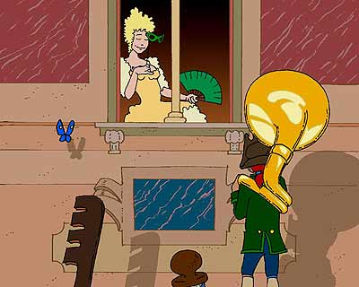 In this scaffolding top, another musician, makes a dawn serenade to a little duchess.