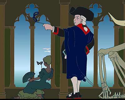 Two scientists dispute. Cyrano of Bergerac fencing with some gangsters.