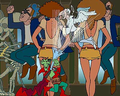 A little devil is made angel to allure one of the girl dancers. But another little devil leaves "tromblon" and draws. A parachutist falls (end of plan 2)