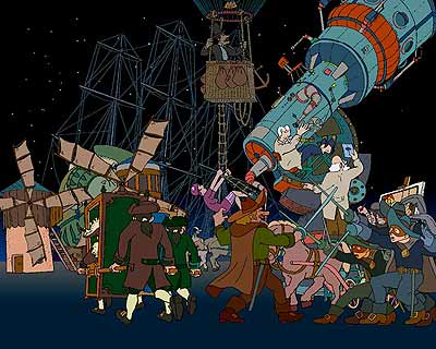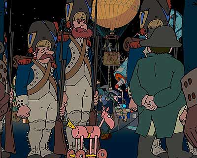 The camera (traveling before) passes between the grognards. A woman is suspended on the balloon nacelle.