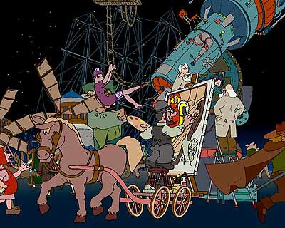 In front of the Don QUichotte mills, The Toulouse-Lautrec cart is drawn by a pony. The red Hood discusses with the wolf...