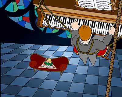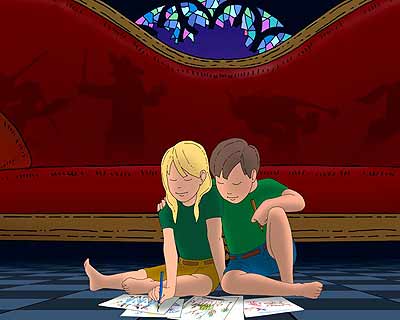 The piano deviates and lets appear two child intertwined in front of a large book.