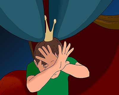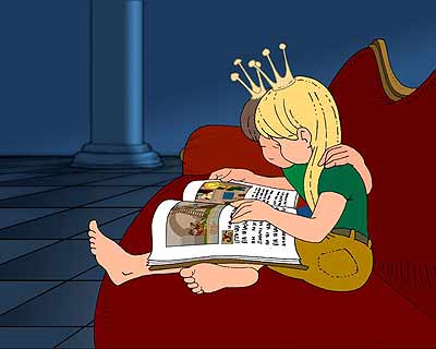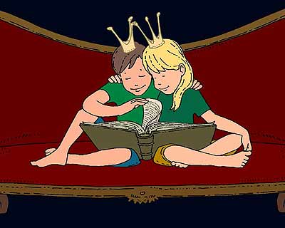 The children, intertwined, turn the pages of the book quietly. Each one carry a crown. (fast Zoom postpones)