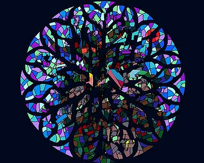 They sat on a couch in front of a Gothic rosette. A shade appears and breaks the rosette in 1000 pieces!