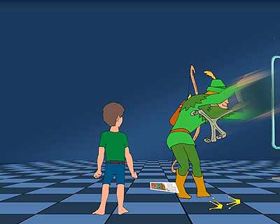 Robin-wood seizes the sceen-TV and throws it in the bucket... He hello the boy and runs about the bucket already gone.